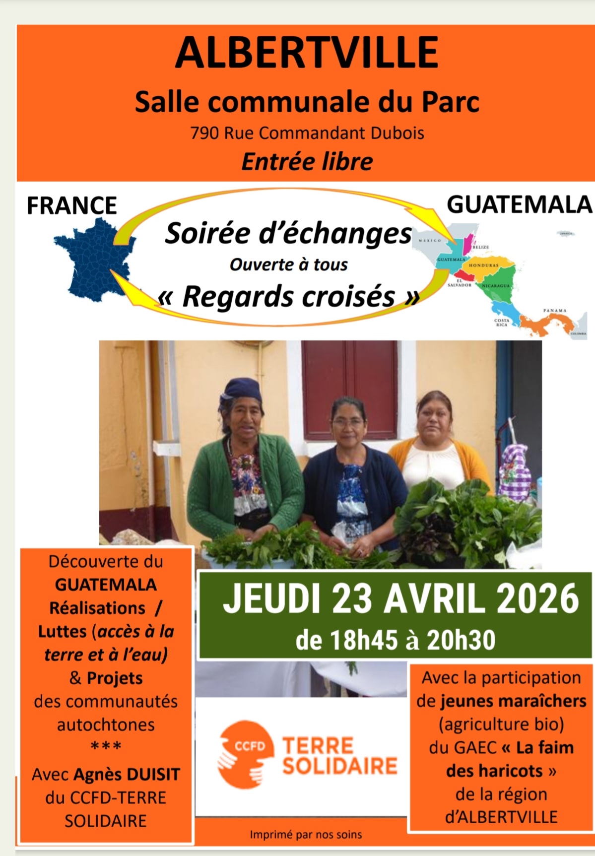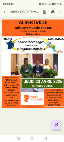 Le jeudi 23 avril aura lieu à la salle communale du parc à 18h45 une soirée d’échanges sur le Guatemala.